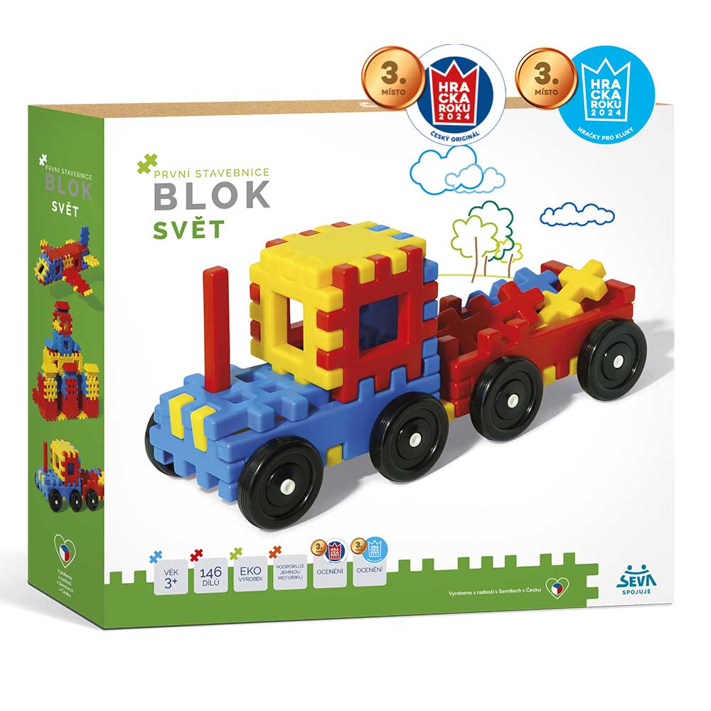 Prvá stavebnica BLOK – Svet poteší tých najmenších staviteľov, a to už od veku 3 rokov. Deti vďaka nej môžu spoznať celý svet, napr. preletieť nad krajinou lietadlom, alebo si zajazdiť po poli vo vlastnom traktore, postaviť si dom, chatu či dokonca originálny hrad. Zo 146 farebných dielikov a koliesok si deti môžu jednoducho vykúzliť svoj vlastný svet!